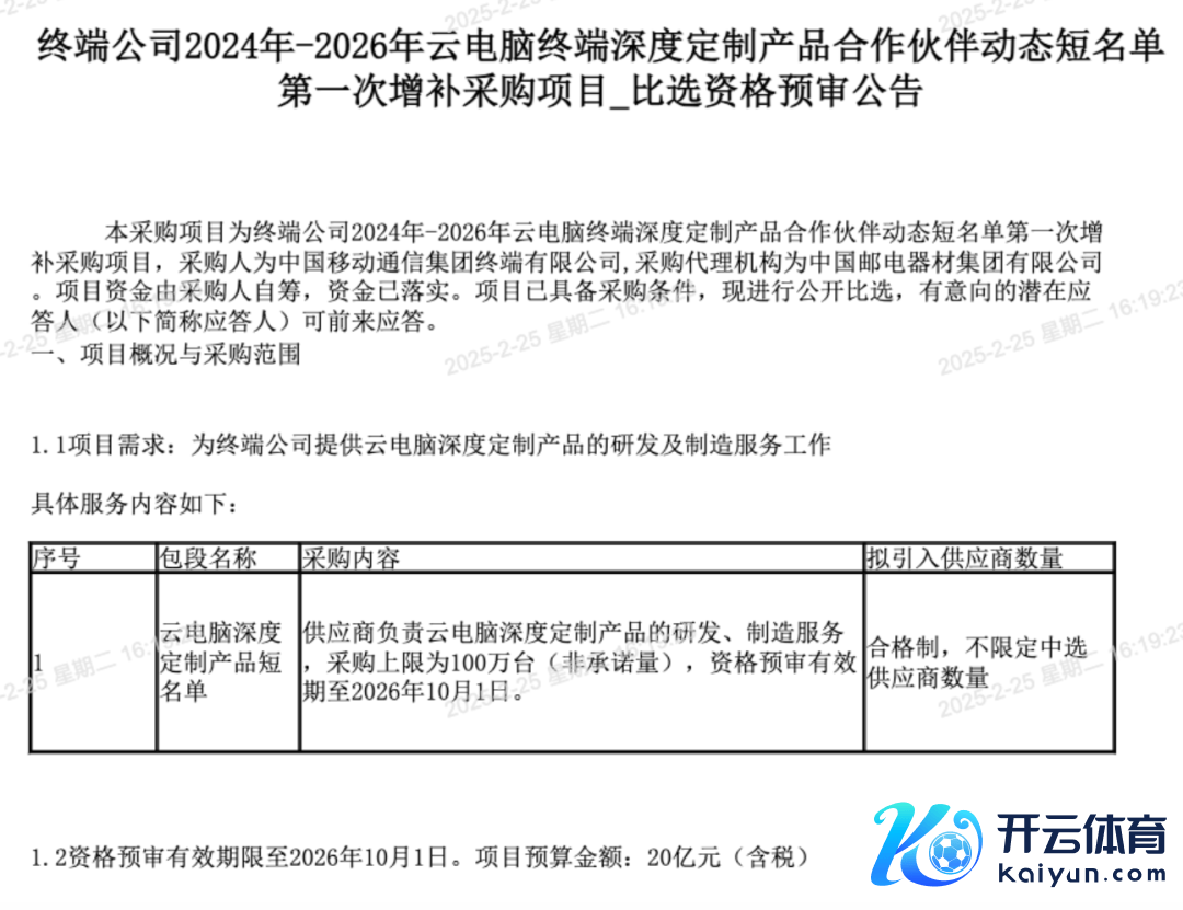 中国转移采购与招标网日前发布终局公司2024-2026年云电脑终局深度定制居品勾联合伴动态短名单第一次增补采购情势比选履历预审公告体育游戏app平台。